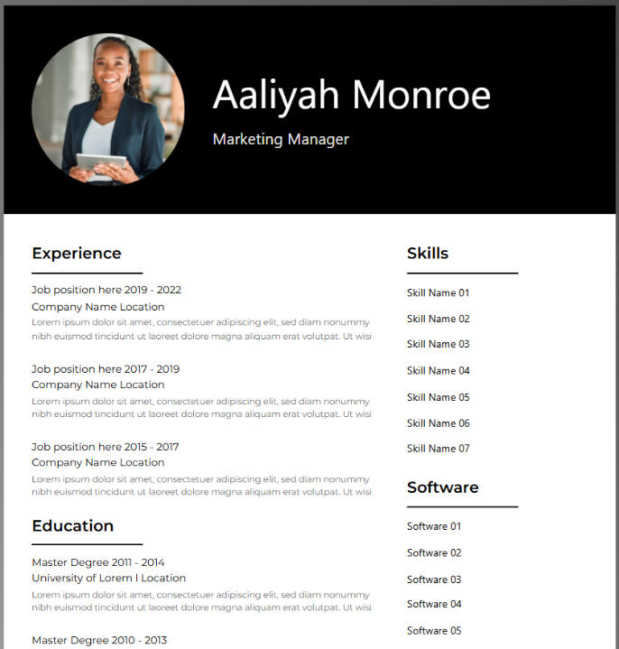 A sleek and straightforward design that showcases Aaliyah’s key skills, experience, and qualifications. This basic yet professional layout focuses on clarity and ease of navigation, giving a clear view of her career highlights.